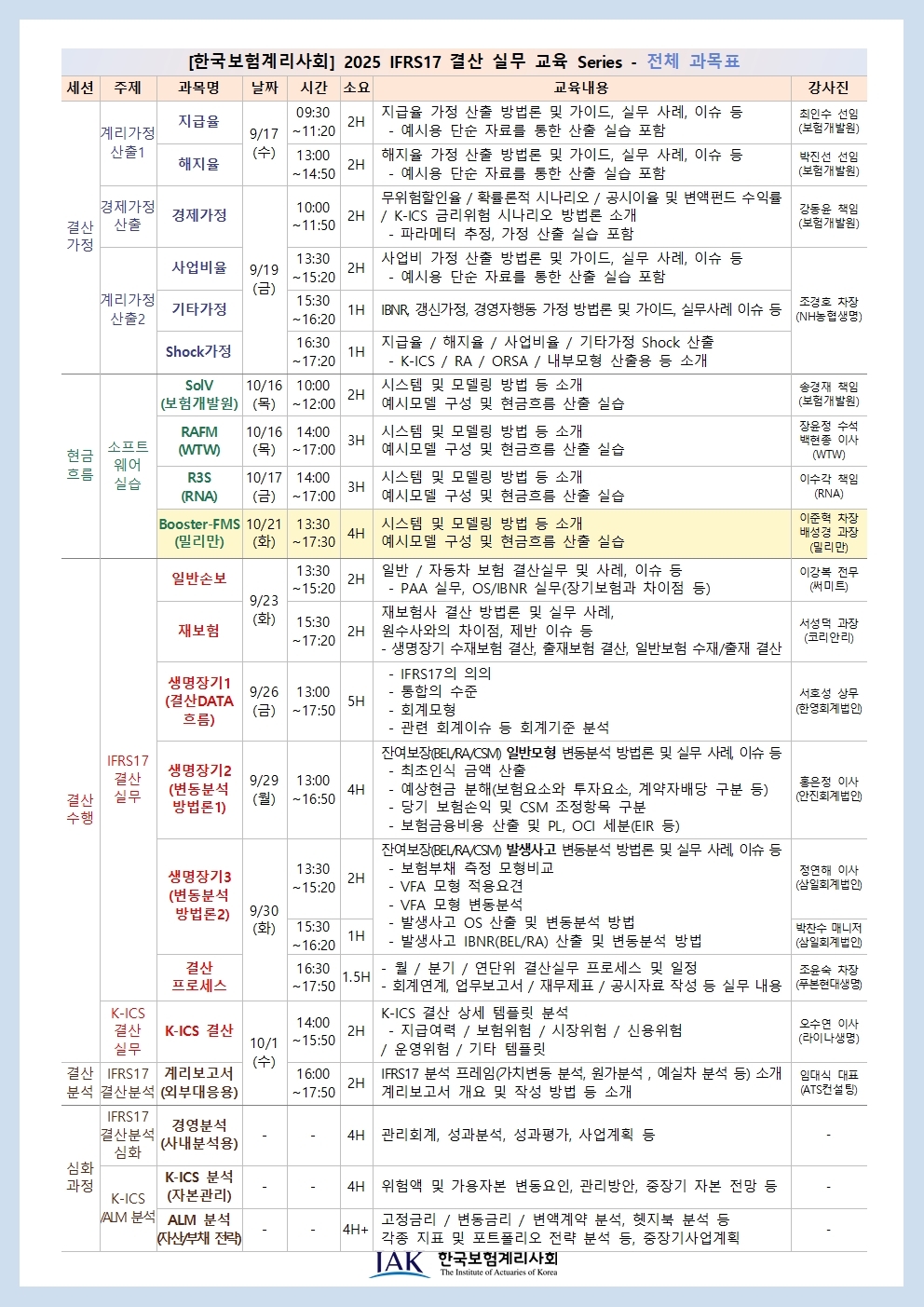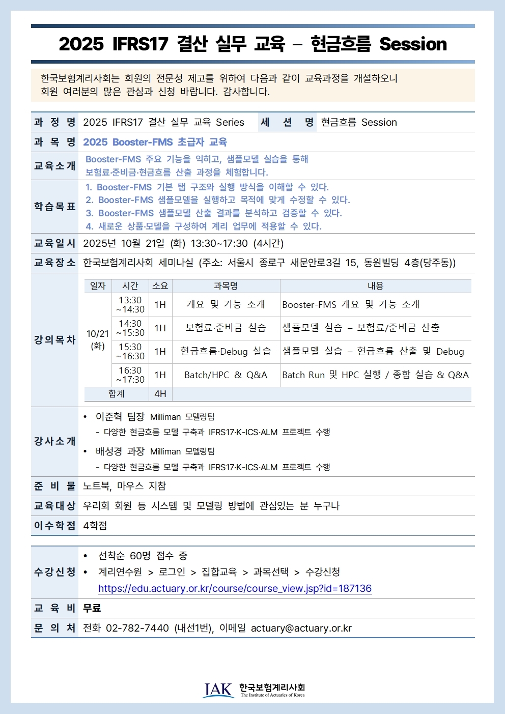 2025 IFRS17 결산 실무 교육 – 「Milliman의 Booster-FMS」를 활용한 현금흐름 산출 교육 과정정보